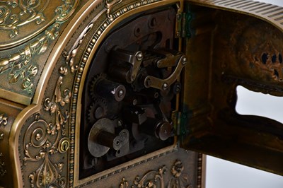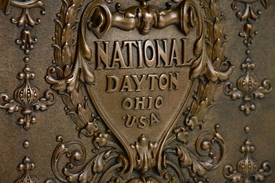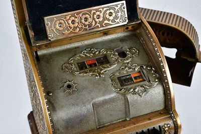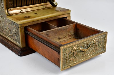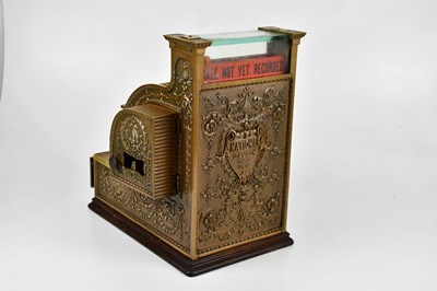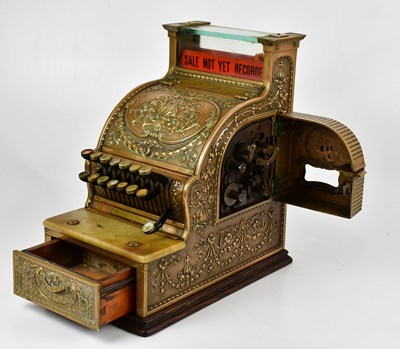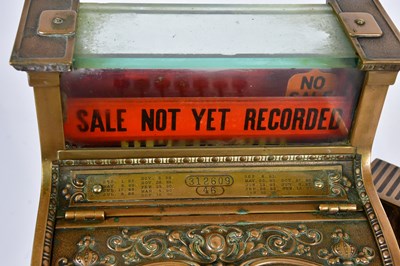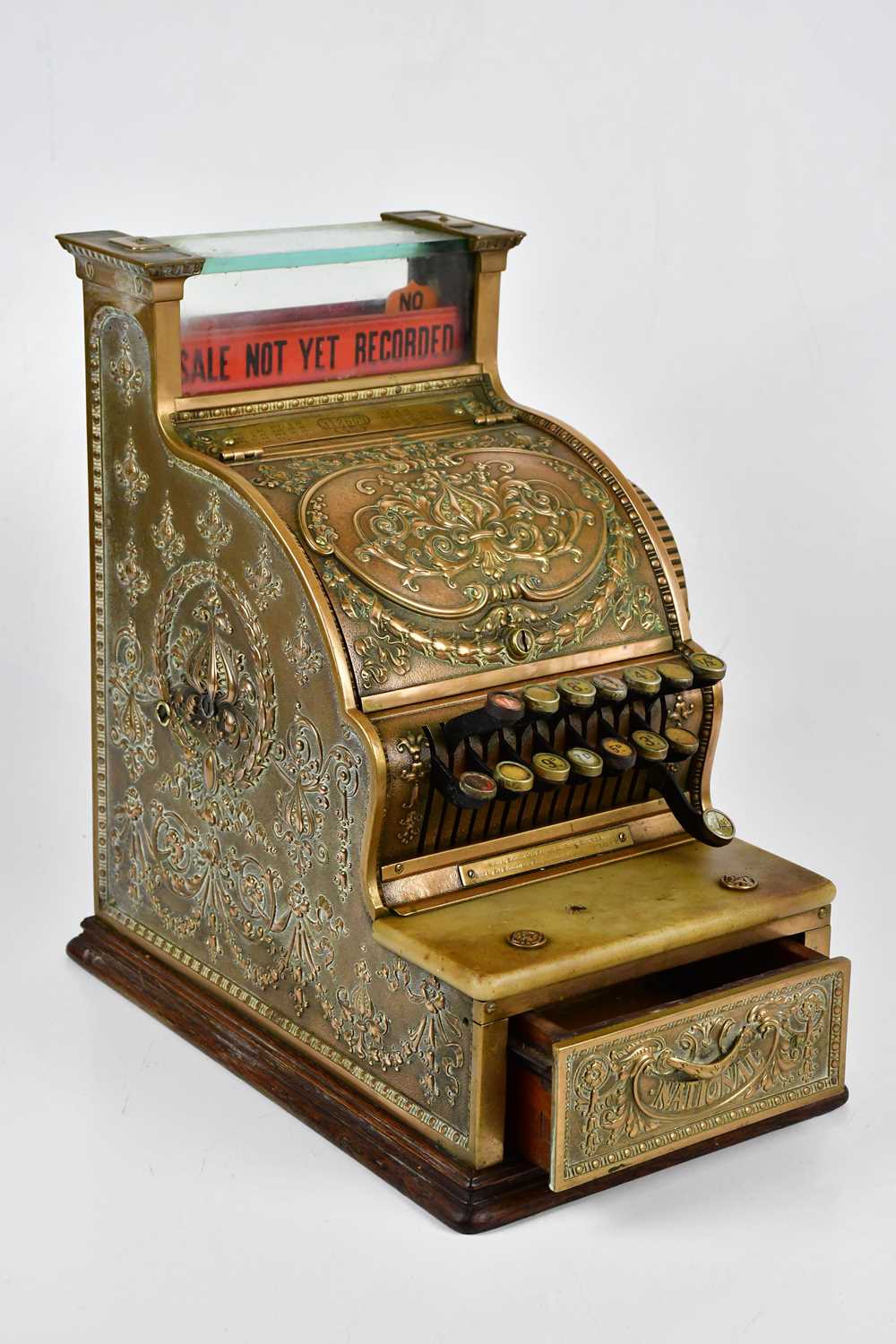 NATIONAL; a brass cash register of small proportions with applied plaque 'Made by National Cash Register Co, Dayton, Ohio, sold by the National Register Company, London', with key, height 45cm, width 30cm.