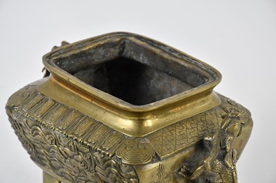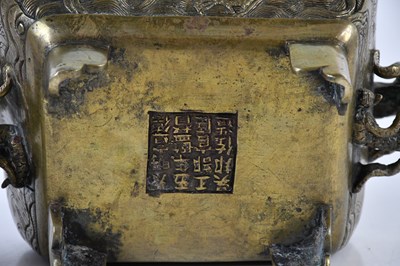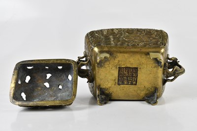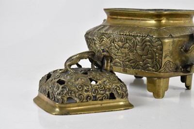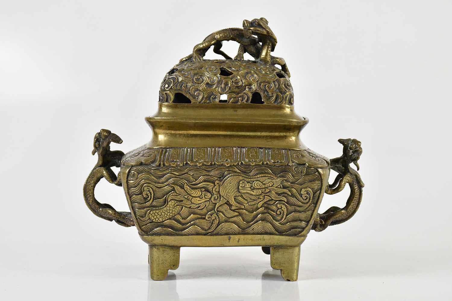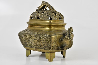 A Chinese bronze censer and cover, the pierced cover with applied mythical creature above two creatures climbing forming handles, decorated with four claw dragon and clouds, with impressed seal mark to the underside, height 20cm, width 24cm, approx 3664g.