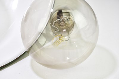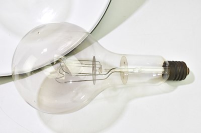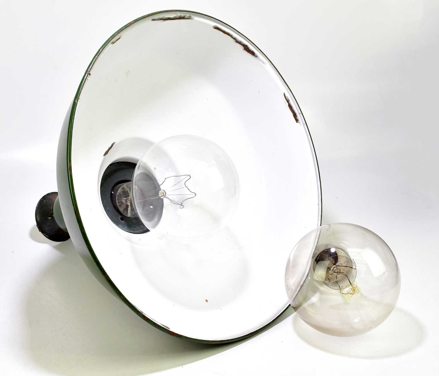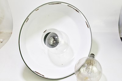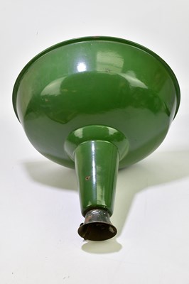 A large modern green painted industrial light shade, diameter 50cm, together with two large bulbs.