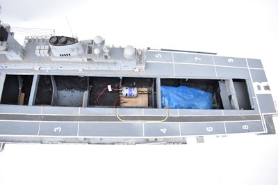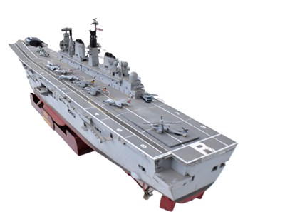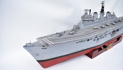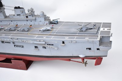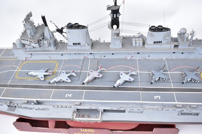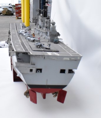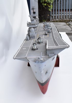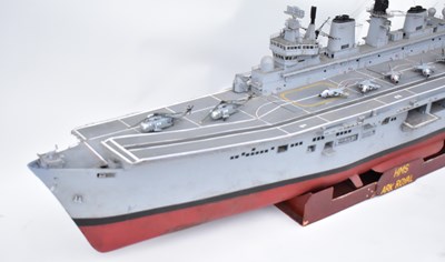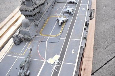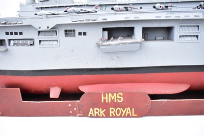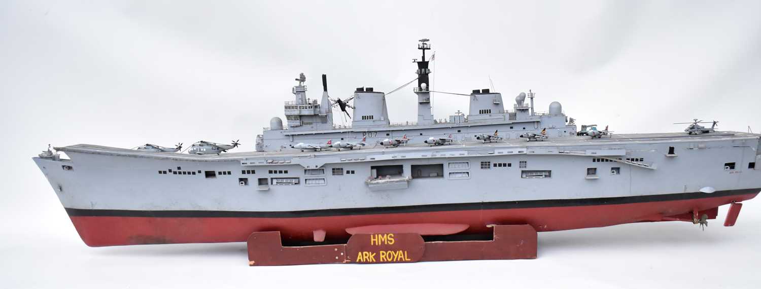 HMS ARK ROYAL R07; a very large wooden model of the aircraft carrier with composite deck buildings, loose plastic aircraft and helicopters, with electric motor, on wooden stand, 68 x 245 x 38cm.