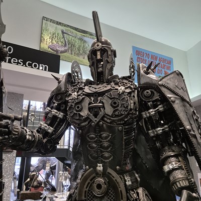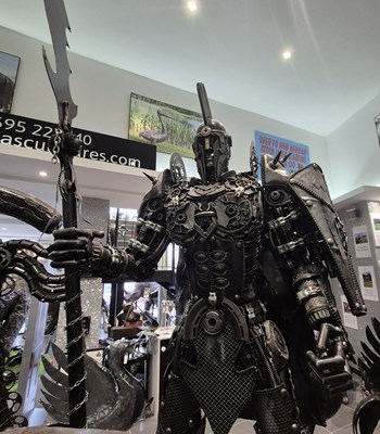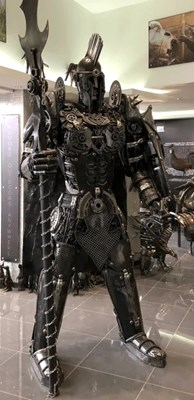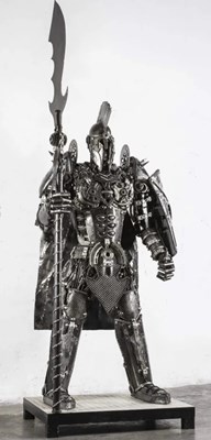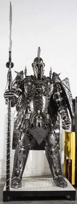 PANGEA SCULPTURES; a large limited edition metal sculpture fabricated from car parts, depicting a 'Spartan Warrior' with halberd, height approx. 262cm.