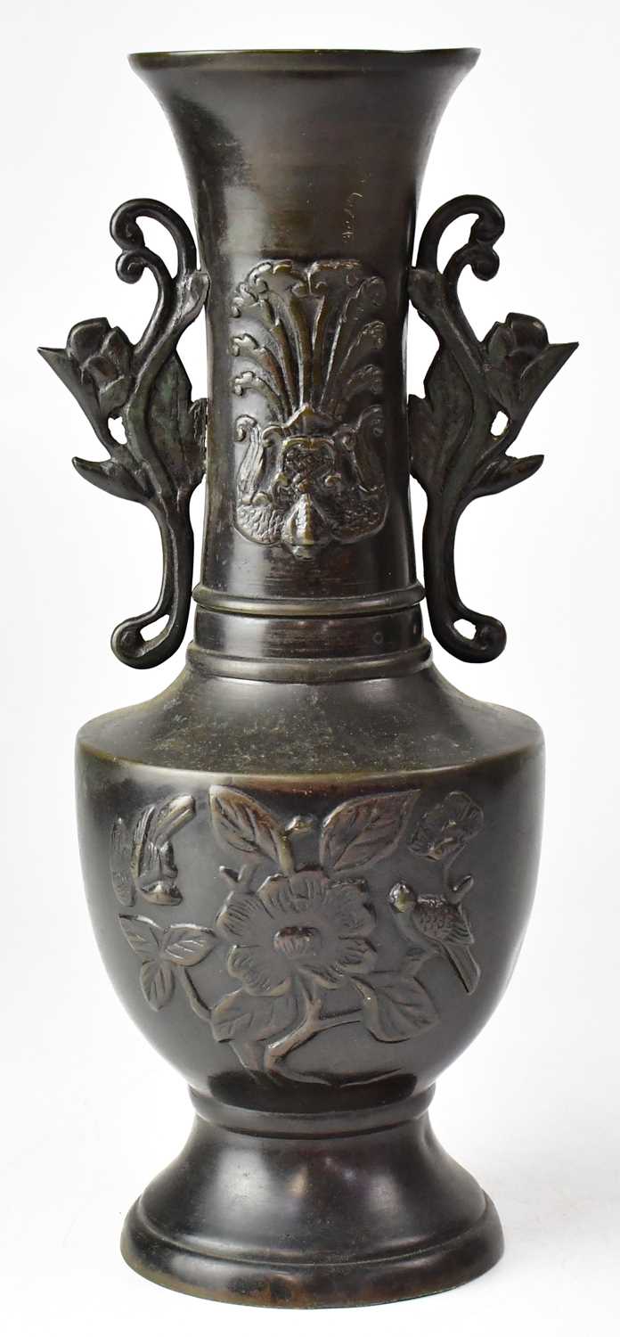 A Meiji period Japanese bronze vase with embossed decoration, height 30cm.
