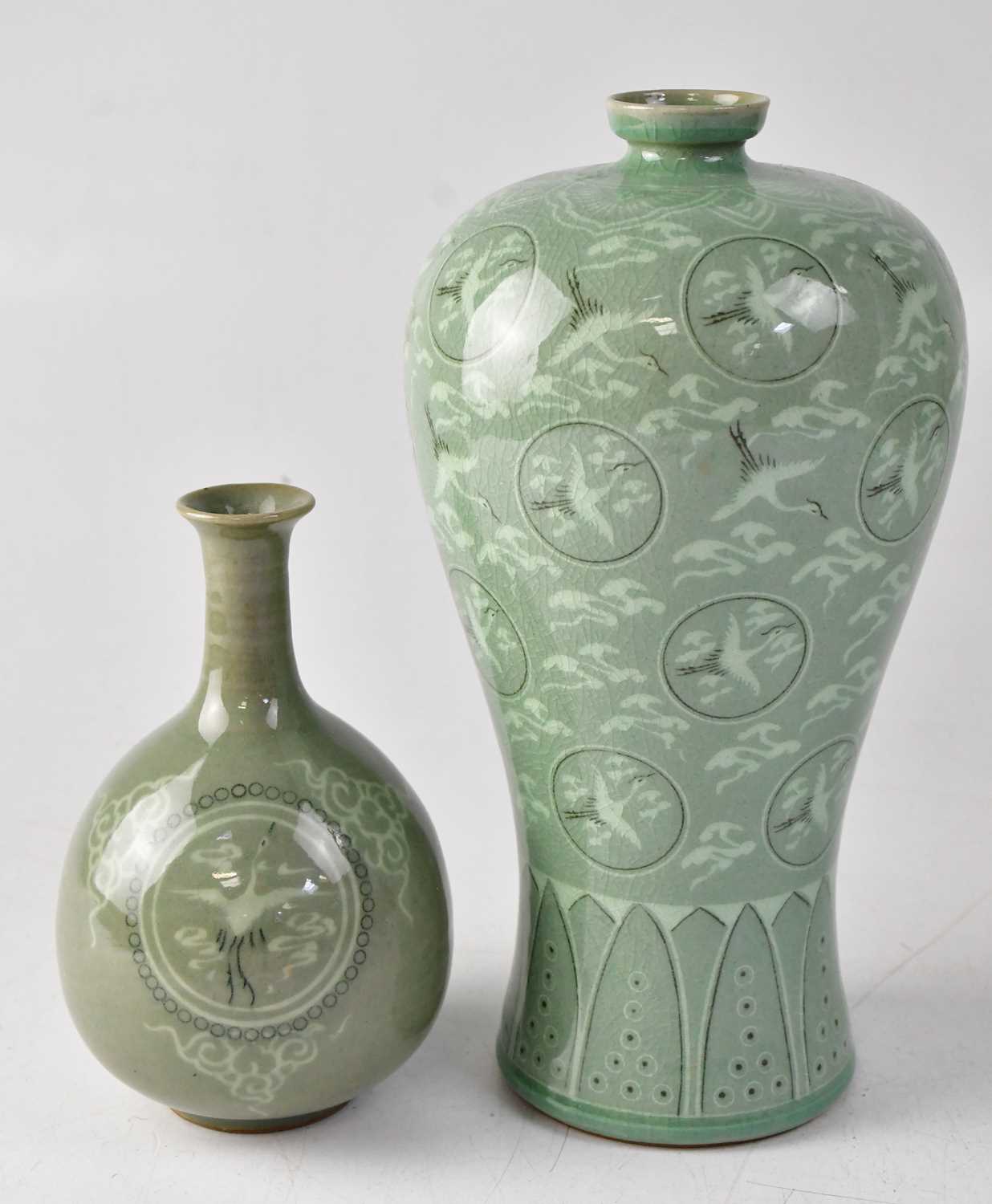 A contemporary Korean celadon glazed vase, inscribed to base 'Korea National Tourism Corp', height 26cm, and a contemporary Korean vase, height 16cm (2).