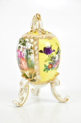 BERLIN; an egg shaped lidded vase, painted with figures in landscape inset between panels of floral detail, on scrolling legs, height 13cm.