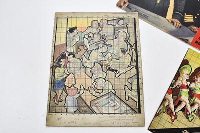 DENIS MCLOUGHLIN (1918-2002); three original watercolour and crayon designs for murals at The Royal Artillery in Woolwich, one depicting a theatre scene in which the artist has illustrated himself within the box, 21 x 27.5cm, one titled 'South Wall' with a cafeteria scene, and the other with a couple beneath a lamp post, with a laminated photograph of the artist painting one of the murals in situ, dated circa. 1943, and a copy of Illustrated Magazine dated November 27th 1943, containing a small article about the murals.
