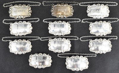 Lot 816 - A set of eleven silver plated spirit decanter...