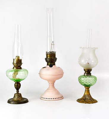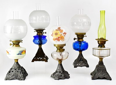 Lot 164 - Five oil lamps with cast metal bases, two with...