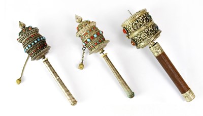 Lot 205 - A pair of Tibetan white-metal prayer wheels...