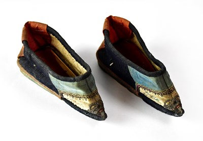 Lot 199 - A pair of Chinese pointed patchwork shoes,...