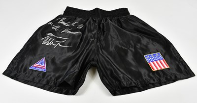 Lot 1374 - MIKE TYSON; a pair of signed shorts, signed...