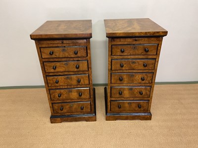 Lot 400 - A pair of figured walnut and ebonised bedside...