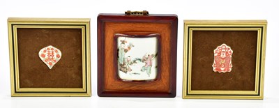 Lot 1350 - Three Chinese porcelain fragments, each framed,...