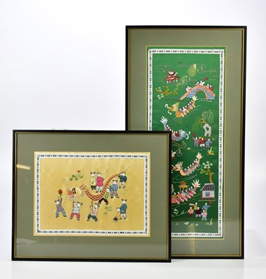 Lot 1355 - Two Chinese silk panels, the larger decorated...